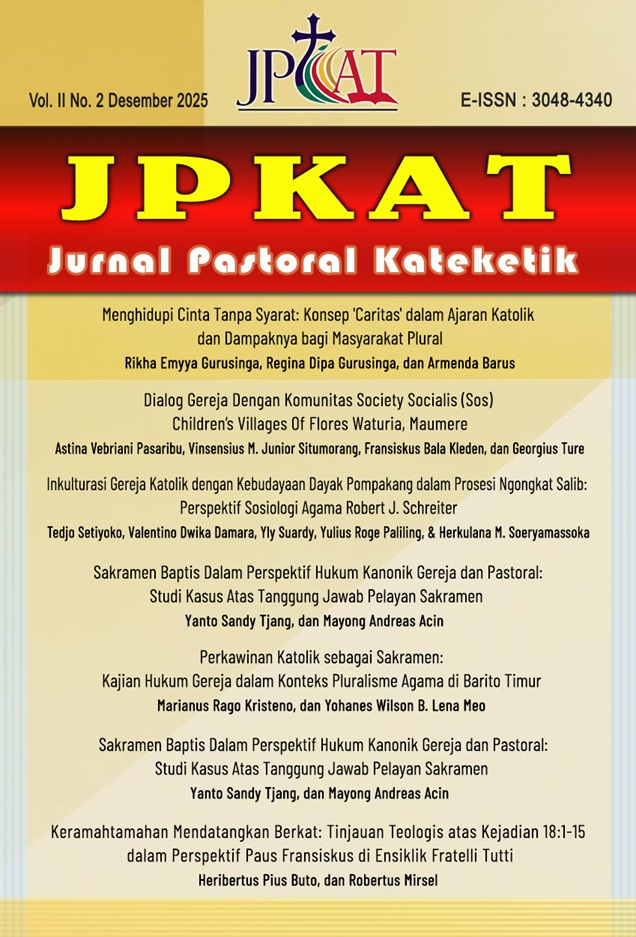 Sakramen baptis menempati posisi yang sangat fundamental dalam kehidupan Gereja Katolik, karena menjadi dasar kehidupan Kristiani serta pintu masuk menuju penerimaan sakramen-sakramen lainnya. Artikel ini mengkaji tanggung jawab pelayan sakramen baptis dari perspektif hukum kanonik dan pastoral, dengan menyoroti tiga isu utama, yakni pencatatan baptis bagi anak adopsi, penanganan kehilangan arsip baptis, serta kelayakan religius sebagai wali baptis. Penelitian ini menggunakan pendekatan kualitatif dengan metode normatif-teologis melalui telaah pustaka terhadap Kitab Hukum Kanonik, Katekismus Gerja Katolik, berbagai dokumen pastoral, serta literatur akademik yang relevan. Hasil penelitian menunjukkan bahwa pelayanan sakramen baptis harus dilaksanakan secara sah, akurat, dan penuh kasih, dengan menyeimbangkan antara ketelitian hukum administratif dan kepekaan pastoral. Dalam pembaptisan anak adopsi, pencatatan harus disesuaikan dengan ketentuan hukum Gereja dan dokumen sipil, sambil tetap melindungi martabat serta privasi anak. Dalam kasus kehilangan arsip baptis, pastor berkewajiban melakukan verifikasi melalui penyelidikan kanonik yang memadai dan, jika diperlukan, melaksanakan baptisan bersyarat untuk menjamin kepastian hukum dan keselamatan rohani. Sementara itu, biarawan maupun biarawati dapat ditunjuk sebagai wali baptis apabila memenuhi ketentuan kanonik dan memiliki kapasitas nyata dalam mendampingi pertumbuhan iman anak baptisan. Penelitian ini menegaskan bahwa setiap bentuk pelayanan Gereja harus berlandaskan prinsip salus animarum suprema lex-bahwa keselamatan jiwa merupakan hukum tertinggi-sehingga pelayanan sakramen baptis mencerminkan integrasi yang utuh antara dimensi hukum, pastoral, dan kasih Kristus yang menyelamatkan.